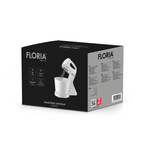 Mixerul cu bol Floria ZLN7577 dispune de o putere de 150W, 7 trepte de viteze si capacitatea de 2 litri. Bolul mixerului este confectionat din plastic si este rotativ insa trebuie rotit manual. Pe langa mixerul cu bolul in sine, in pachetul produsului se regasesc inca 4 accesorii ( 2 carlige si 2 teluri ). Pe dispozitiv se regaseste buton pentru scoaterea telurilor. Nivelul sonor: 70-75 dB.
