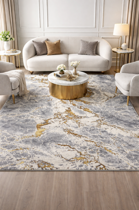 Covorul modern Buse Storm aduce un plus de dinamism și eleganță în orice încăpere prin modelul abstract și combinația modernă de gri si auriu. Designul său creează un efect vizual deosebit, ideal pentru interioare contemporane.