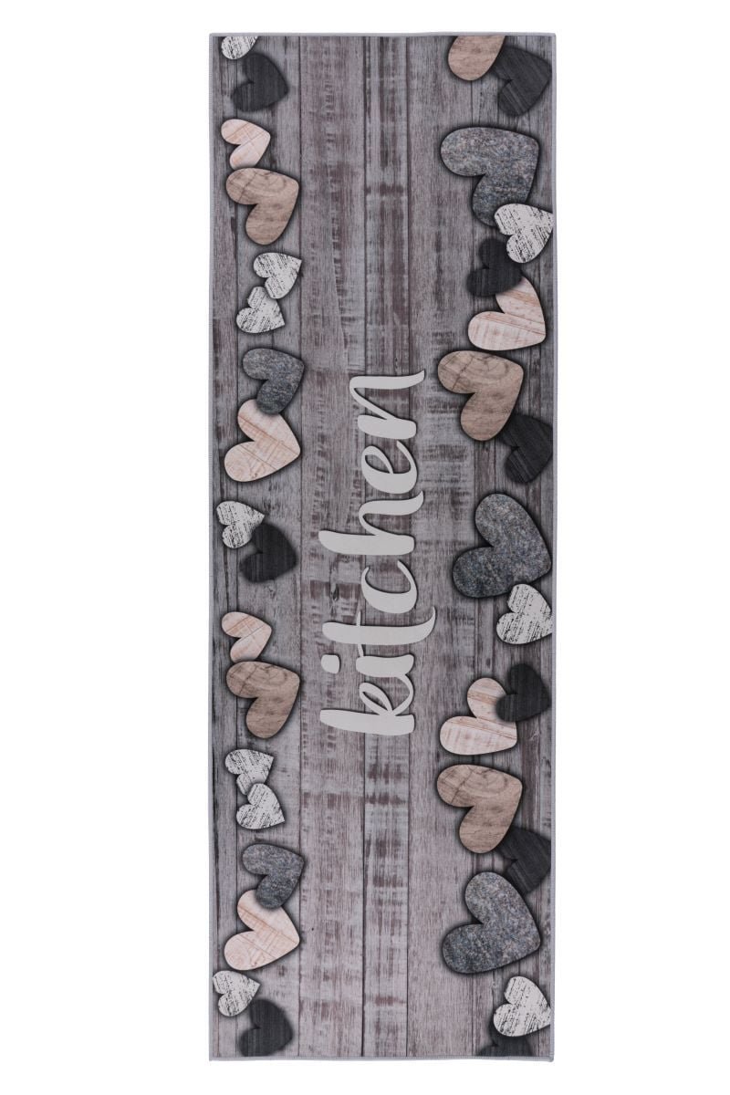 Transformă bucătăria ta cu un covor modern și funcțional! Acest covor de bucătărie are un design rustic, cu efect de lemn și decor cu inimioare, aducând un plus de căldură și stil în spațiul tău.