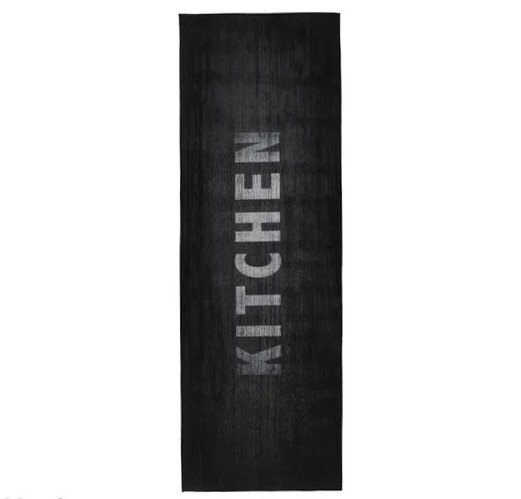 Covor de bucătărie antiderapant, lavabil, 60x180 cm – Negru cu text „KITCHEN”