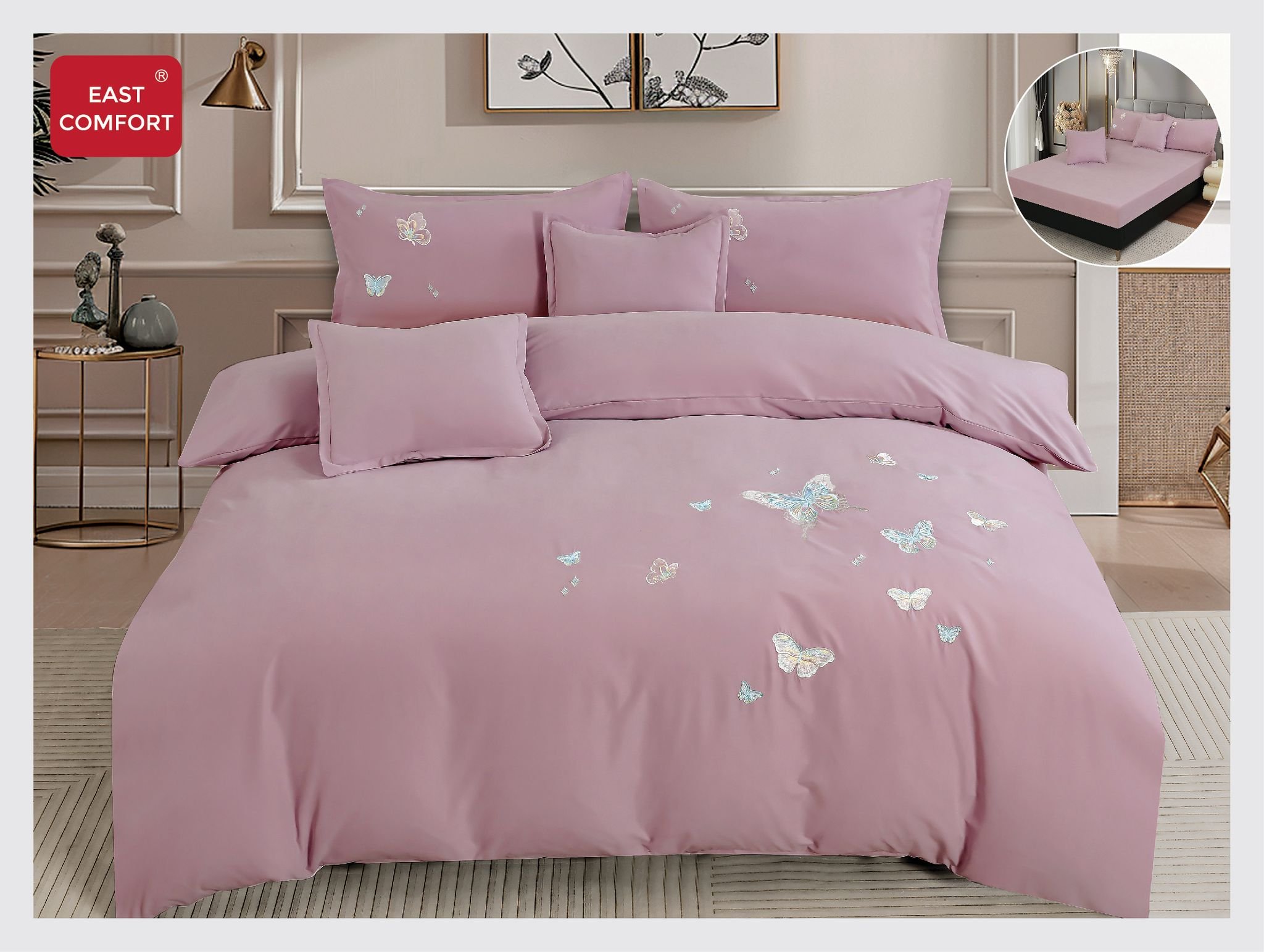 Lenjerie de pat cu broderie, cearșaf cu elastic, roz prăfuit