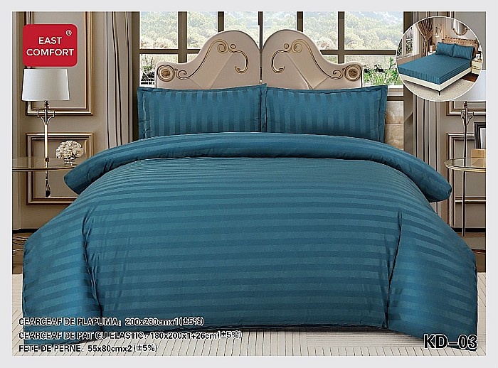 Lenjerie de pat, tip damasc, cearșaf cu elastic , albastru petrol