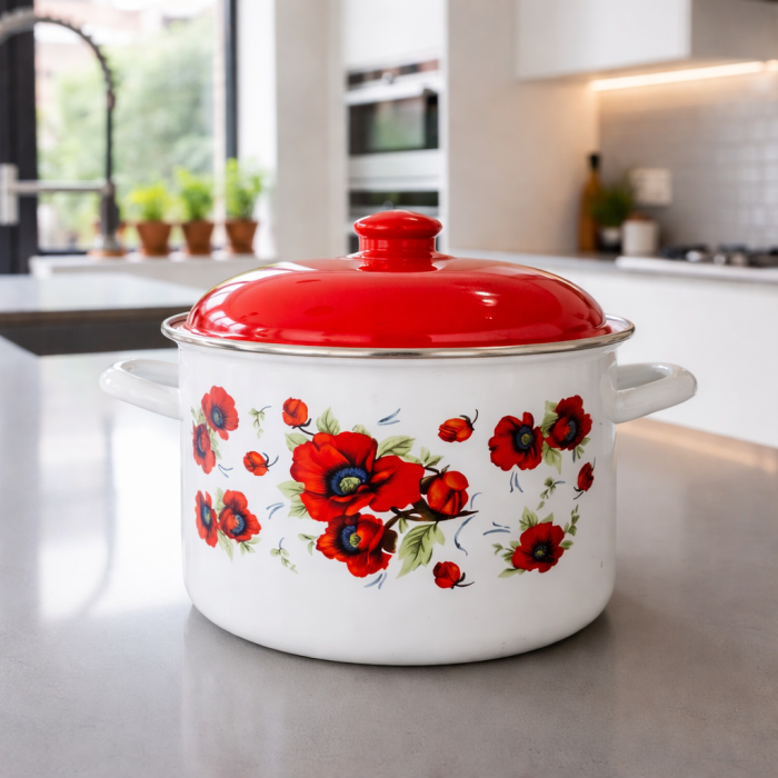 Oala emailată cu design floral este ideală pentru gătitul zilnic, fiind ușor de întreținut și compatibilă cu plitele cu inducție. Suprafața emailată rezistentă permite curățare rapidă și păstrează gustul natural al alimentelor.
