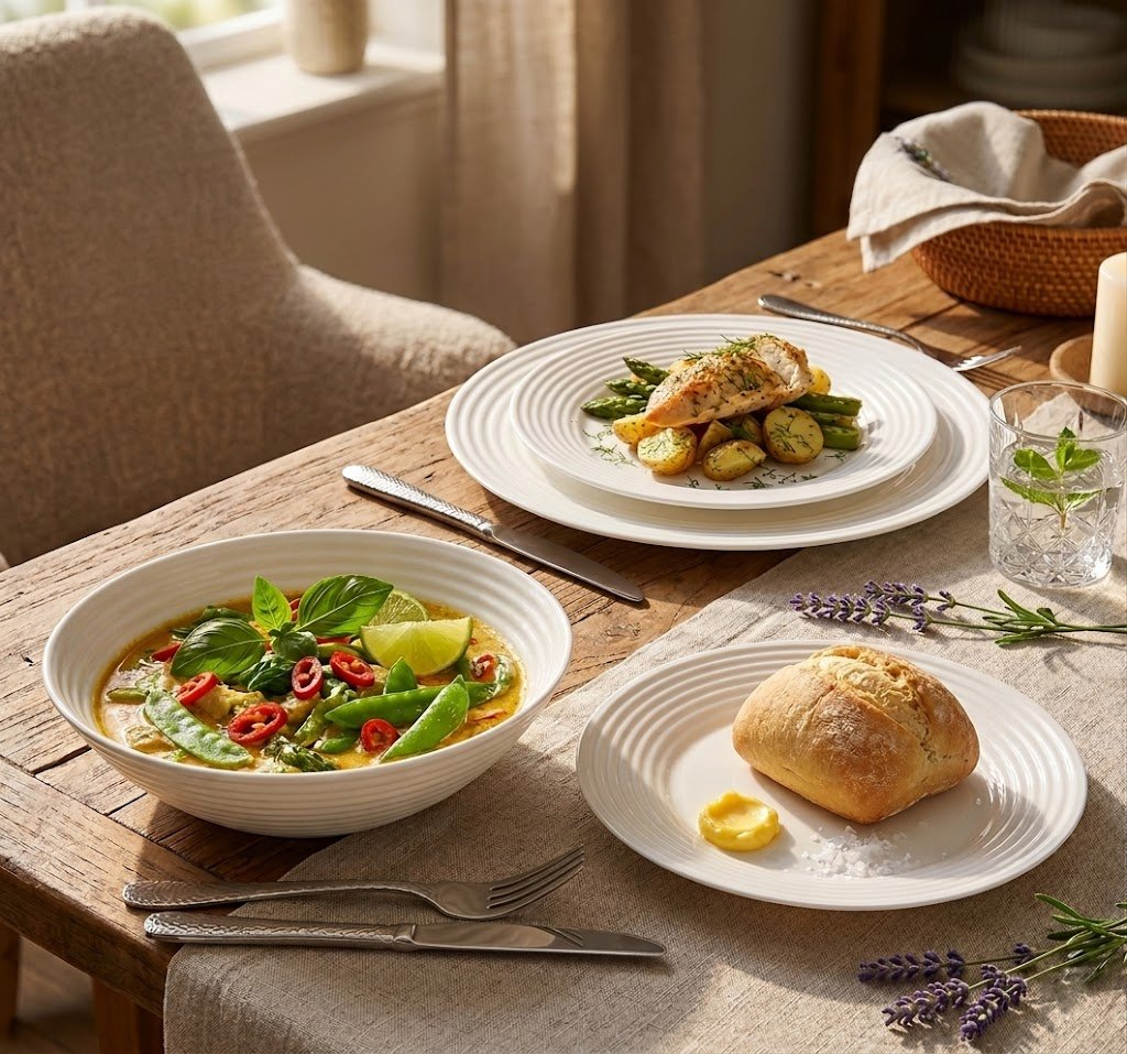 Setul de farfurii Vela 19 piese aduce un plus de eleganță modernă pe masa ta. Designul striat în cercuri concentrice îl face să iasă în evidență față de farfuriile clasice, păstrând în același timp versatilitatea culorii albe pure care se potrivește oricărui decor.
