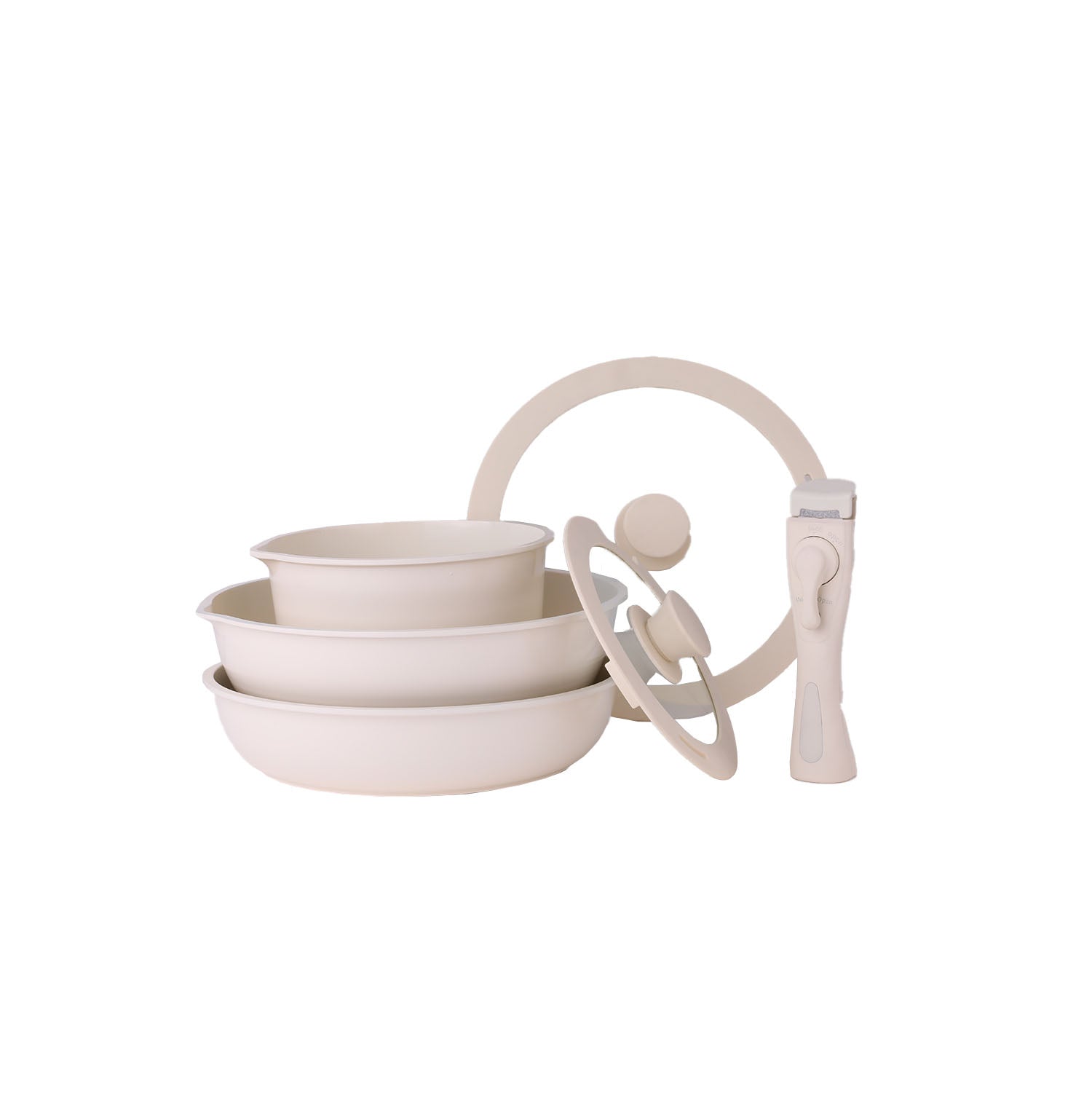 Set 5 piese din ceranica, compus din 2 oale, 1 tigaie si 2 capace de sticla, crem, ZILAN.