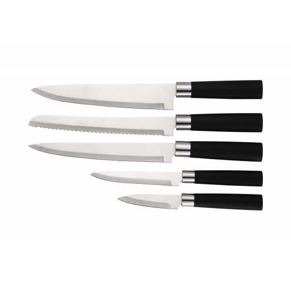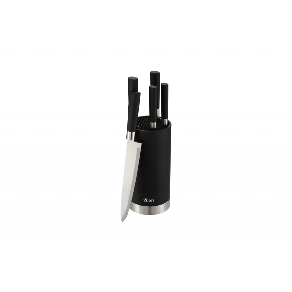 Setul de cutite RETRO Zilan ZLN1609 contine 6 piese, acestea fiind, 5 cutite si un suport. Manerele cutitelor si suportul acestora sunt de culoare neagra. Manerele si suportul au un invelis de material cu atingere moale.