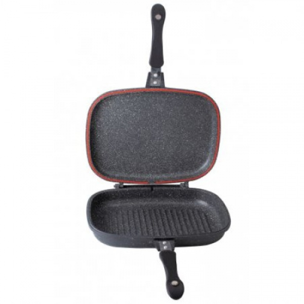 Tigaia este fabricata din aluminiu turnat sub presiune pentru o durata de functionare indelungata, placata interior si exterior cu marmura, manere bachelita prevazute cu magneti pentru o mai buna etansare, caldura distribuita in mod egal datorita garniturii siliconice care etanseaza tigaia, dimensiune tigaie 30x22 cm, adancime 4.5 cm x 2. Puteti gati in ea carne de pui, peste, carne rosie (vaca, porc, oaie etc.), oua si puteti tot odata sa faceti si cartofi prajiti. Daca intoarceti tigaia pe partea cu striatii veti putea face gratare minunate fara fum in bucatarie. Toate acestea le puteti gati fara sau cu cateva picaturi de ulei. Pachetul contine garnitura din silicon de rezerva.Disponibil pe mai multe culori.